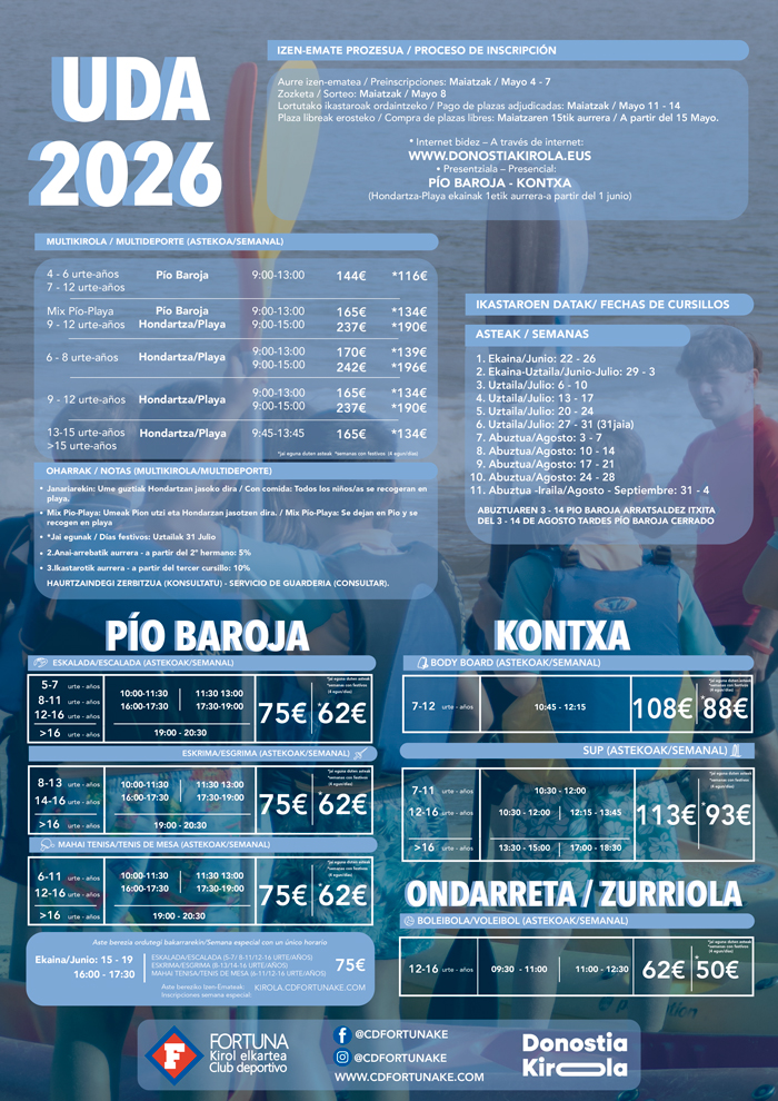 Como cada año desde el Club Deportivo Fortuna os ofrecemos una amplia oferta de cursos para que este verano tanto mayores como txikis nos divirtamos haciendo deporte.